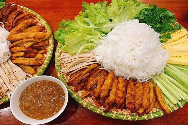 La spécialité locale. Il s'agit d'un plat de rouleaux de printemps frais à composer soi-même, composé de porc fermenté grillé, de papier de riz croustillant et de mangue verte, le tout trempé dans une sauce riche à base de cacahuètes. Goûtez-le chezDang Van Quyen.