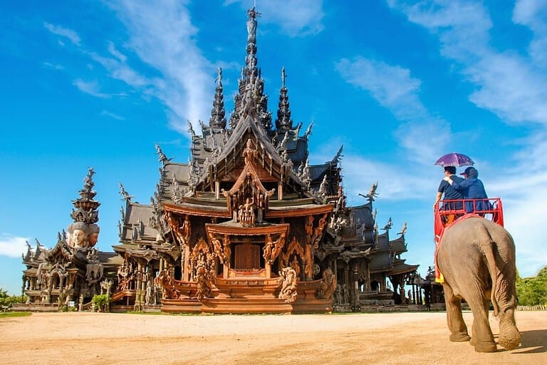 Visitez leSanctuaire de la Vérité, une impressionnante structure géante en bois entièrement sculptée à la main, sans aucun clou métallique. C'est une merveille architecturale située au bord de l'océan.
