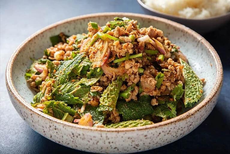 Le plat national du Laos. Il s'agit d'une salade de viande hachée (généralement du porc ou du poulet) épicée, acidulée et pleine de saveurs, mélangée à des herbes fraîches, du jus de citron vert et de la poudre de riz grillé. À déguster avec du riz gluant.