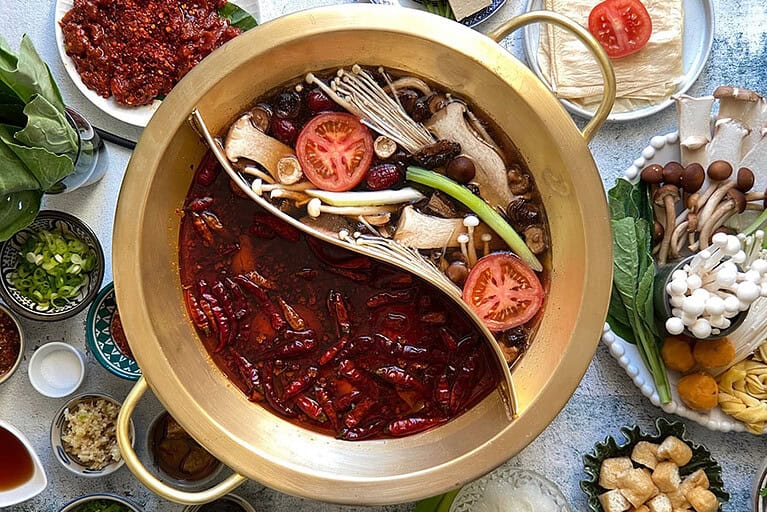 Le plat le plus célèbre du Yunnan. On vous sert un bol de bouillon de poulet bouillant et riche, ainsi qu'un plateau de viandes crues, d'œufs de caille, de légumes et de nouilles de riz. Vous cuisinez vous-même les ingrédients en les plongeant dans la soupe chaude.